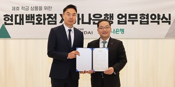 현대백화점이 하나은행과 손잡고 다양한 쇼핑 혜택을 담은 적금 상품을 출시한다.현대백화점은 하나은행과 제휴 적금 상품 출시를 위한 업무협약(MOU)를 체결했다고 15일 밝혔다. 서울 강남구 현대백화점 본사에서 진행된 협약식에는 정지영 현대백화점 사장과 이호성 하나은행장
