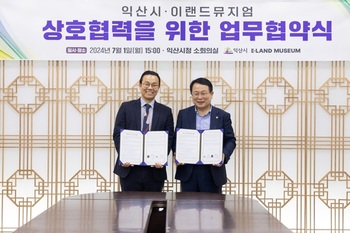 이랜드뮤지엄은 익산시와 세계문화예술산업 소장품 전시를 위한 업무협약을 체결했다고 2일 밝혔다.지난 1일 익산시 소회의실에서 진행된 협약식에는 정헌율 익산시장, 이랜드뮤지엄 한우석 대표, 이랜드뮤지엄 서영희 전시 이사, 배석희 경제관광국장 등 관계자 10여 명이 참석했다