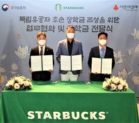 스타벅스커피 코리아가 국가보훈처, 사회복지공동모금회와 함께 독립유공자 후손 장학금 조성을 위한 업무 협약 및 장학금 전달식을 진행했다고 29일 밝혔다.스타벅스 지원센터(서울 중구 퇴계로)에서 진행된 이번 행사에는 스타벅스커피 코리아 송호섭 대표이사와 국가보훈처 이남우