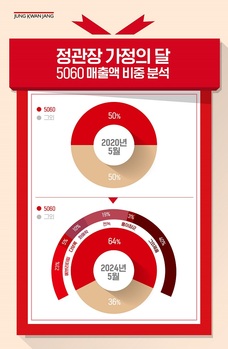 정관장이 가정의 달을 앞두고 최근 5년간 매출을 분석한 결과 ‘5060’ 세대 비중이 가장 높은 것으로 나타났다고 28일 밝혔다.가정의 달은 어버이날, 스승의 날, 부부의 날이 있어 젊은 세대의 매출 비중이 높은 편이다. 실제로 2020년 5월 2040과 5060의 매