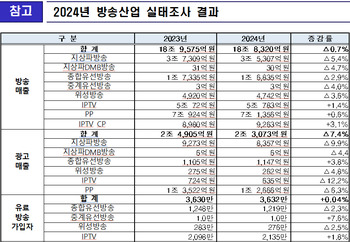 방송산업이 광고 부진 영향으로 매출 하락세가 지속되면서 2년 연속 역성장을 기록했다.방송미디어통신위원회는 31일 ‘2024년 방송산업 실태조사’ 결과를 발표했다. 지난해 국내 방송시장 규모는 매출액 기준 18조8320억원으로 전년 대비 0.7% 감소했다. 20