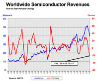 지난 2월 전 세계 반도체 매출이 전년 동기 대비 20% 이상 감소하며 벌써 6개월 연속 감소세를 이었다. 지난해 하반기부터 이어진 급격한 수요 감소와 재고 확대에 이미 삼성전자를 제외한 주요 제조사들이 감산에 나섰는데 올 들어서도 좀처럼 회복 기미가 나타나지 않자 삼