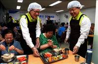 NH농협금융지주 김용환(왼쪽 서 있는 사람) 회장과 임직원 봉사단은 30일 서대문구 홍은종합사회복지관을 방문해 봉사활동을 했다. 봉사단은 복지관 노인 300여 명을 대상으로 배식 봉사활동을 진행했으며 거동이 불편한 75명의 노인에게는 직접 음식을 배
