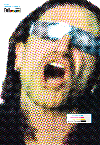 왼쪽 그림은 그 중 한 작품인 ‘BONO'의 원본을 멀리서 본 모습이다. 아는 사람들은 곧 ’아! U2의 리드싱어 보노구나!‘ 할 것이다. 언뜻 보기에는 조악한 인쇄물 같다. 하지만 자세히 들여다보면?
