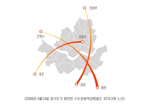 여기에 국토해양부가 발표한 2020 '국가철도망 구축계획(안)'에 GTX 3개 노선을 반영함에 따라 실현 가능성도 더욱 높아졌다.