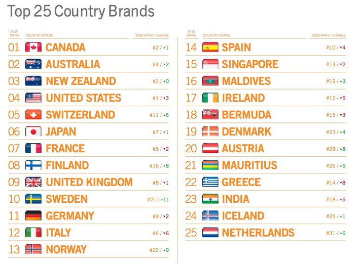 브랜드 자문회사인 퓨쳐브랜드(FutureBrand) 사에서 발표한 2010년 국가브랜드 지수 도표에 의하면 작년도 2위를 차지했던 캐나다가 마침내 1위를 차지한 반면, 작년 1위였던 미국은 4위로 하락했다고.