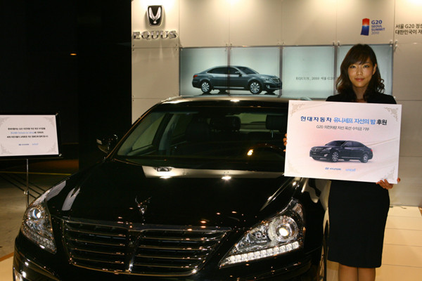 현대자동차(회장 정몽구. 이하 현대차)는 19일 저녁, 서울 용산 그랜드 하얏트 호텔에서 열리는 ‘2010 유니세프 자선의 밤’에서 G20 정상회의 의전용 에쿠스 리무진 3대를 자선 경매에 내놓은 뒤 그 수익금 일부를 유니세프의 아프리카지역 교육환경 개선 사업인 ‘School for Africa’에 기부할 예정이라고 밝혔다.