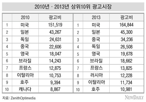 한편 러시아 역시 2012년에는 호주와 캐나다를 재치고 세계 10위권에 드는 광고시장으로 성장하여 2013년에는 이탈리아가 차지하고 있는 8위 자리를 빼앗을 것으로 예상했다.
