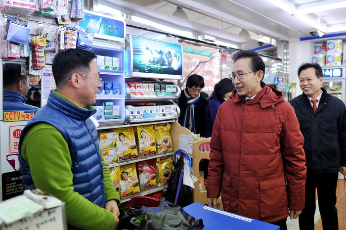 이 대통령은 이어 인테리어 가게 사장이 "부동산 경기가 죽어 어렵다"고 말하자 "부동산은 조금씩 살아나는 것 같더만..."이라고 격려했다.