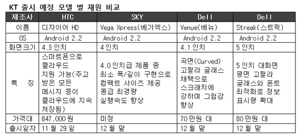 KT는 스마트폰 보급 확산으로 음성에서 무선데이터로 사용패턴이 이동함에 따라 소비자 선호를 고려하여 ‘델(Dell)’ 의 5인치 스마트폰‘스트릭’, 4.1인치 ‘베뉴’와 팬택의 ‘베가 엑스’등 4인치 이상 대화면 스마트폰 3종을 추가로 연내 출시한다고 밝혔다.