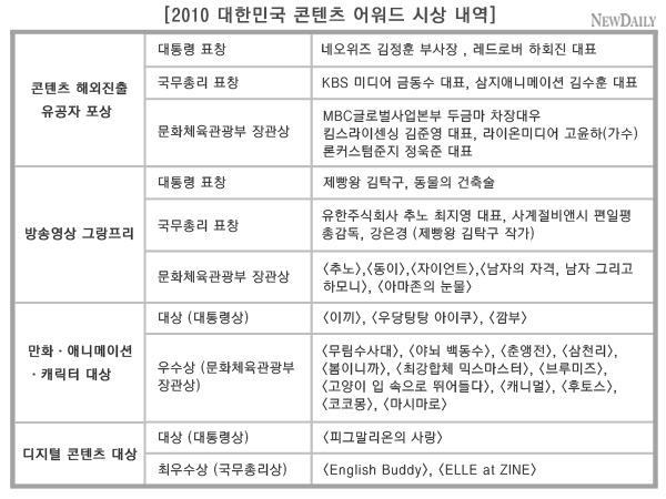 문화체육관광부(유인촌 장관)가 주최하고 한국콘텐츠진흥원(원장 이재웅)이 주관하는 '2010 대한민국 콘텐츠 어워드'가 20일 4시 상암동 누리꿈스퀘어에서 개최된다. 2009년 '대한민국 콘텐츠 해외진출 유공자 포상', '대한민국 만화·애니메이션·캐릭터 대상', '디지털콘텐츠 대상'을 통합하면서 시작된 본 행사에는 올해부터 '방송영상 그랑프리' 분야까지 통합되며 콘텐츠 전 분야를 포괄하는 시상식으로 그 자리를 굳혔다.