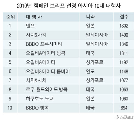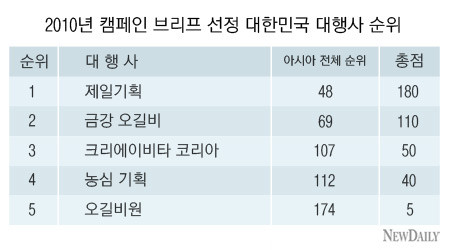 광고 전문지 캠페인브리프(Campaign Brief) 아시아 판에서는 2010년을 결산하며 각국의 최고 대행사를 선정해 발표했다. 여기서 제일기획은 180점을 받아 110점으로 2위를 차지한 금강 오길비를 따돌리고 1위를 차지했다.
