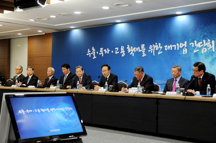 이명박 대통령은 24일 이건희 삼성전자 회장과 정몽구 현대기아차그룹 회장 등 국내 30대 기업 총수들이 참석한 가운데 서울 여의도 전국경제인연합회에서 오찬 회동을 겸한 '수출·투자·고용확대를 위한 대기업 간담회'를 주재했다.