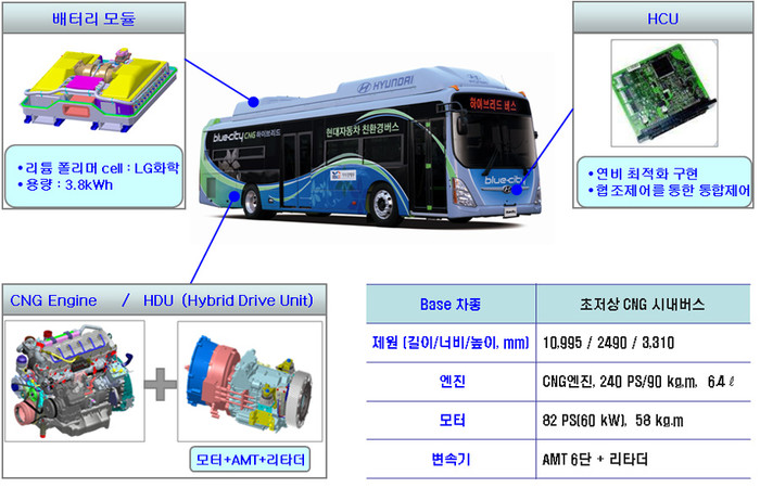 오늘 출시되는 CNG 하이브리드버스는 엔진, 전기 배터리 및 모터, 전자제어장치로 구성돼 적절하게 동력원을 달리하여 연료소비를 최소화 할 수 있는 차량이다.