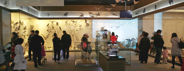 제1전시실에는 한반도의 다양한 고유생물과 자생생물의 식물표본을 5계(원핵생물, 원생생물, 진균, 식물, 동물)로 나누어 전시하고 있다. -