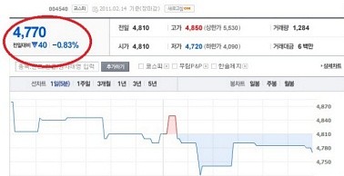 포털사이트에 등재된 A회사의 주가지수를 살펴보면 실제로 주가가 전일대비 0.83% 하락, 현재가 4770원을 유지하고 있는 것으로 나타났다.