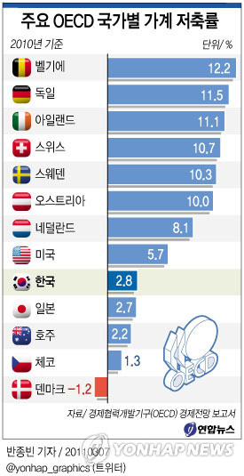 7일 경제협력개발기구(OECD)의 경제전망 보고서에 따르면 지난해 우리나라의 가계 저축률(저축액/가처분소득)은 2.8%로, 저축률 자료가 제시된 20개 회원국의 평균 저축률 6.1%에 크게 못미쳤다.