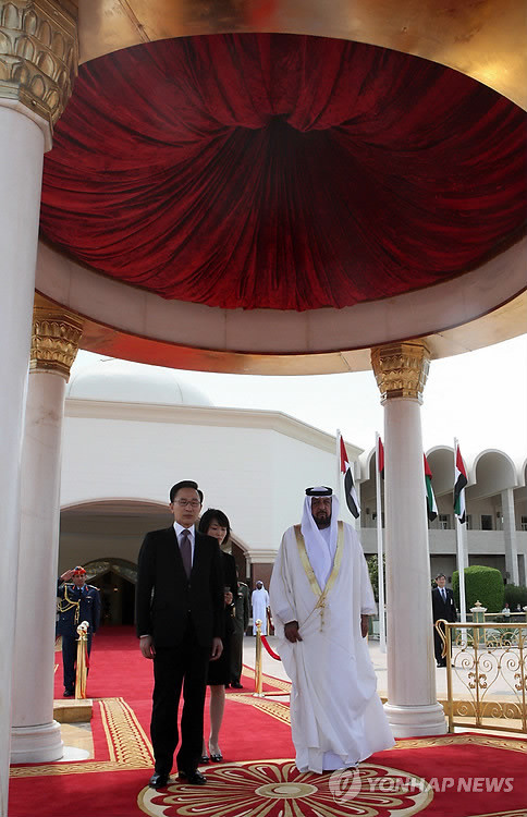 이명박 대통령은 아랍에미리트(UAE) 방문 이틀째인 13일 칼리파 빈 자이드 알 나흐얀 대통령과 정상회담을 갖고 에너지와 건설, 보건 등 경제협력 방안을 논의했다.