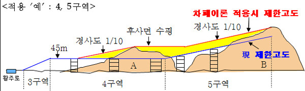 현재 고도제한은 전방, 측방 중 제4구역의 경우 높이 45m 이하(건물 약 12층)이며, 제5구역은 제4구역을 기준으로 경사도의 10분의 1이 적용되고 있다. 하지만 차폐이론을 적용하면 그 제한 높이가 크게 낮아진다. 각 비행장별 장애물에 따라 다르지만, 수색비행장의 경우 최대 50m(60m→110m)의 고도제한 완화가 예상된다. 이번 조치를 통해 고도제한이 완화될 수 있는 지역은 약 7,644만㎡(약 2,316만 평)로 여의도 면적의 약 26배에 달한다.