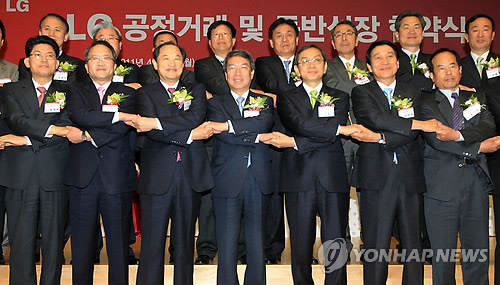 LG는 18일 서울 양재동 LG전자 서초 R&D 캠퍼스에서 전자와 화학, 디스플레이 등 6개 계열사와 협력사 대표, 김동수 공정거래위원장, 정운찬 동반성장위원장 등이 참석한 가운데 'LG-협력회사 공정거래 및 동반성장 협약식'을 개최했다.