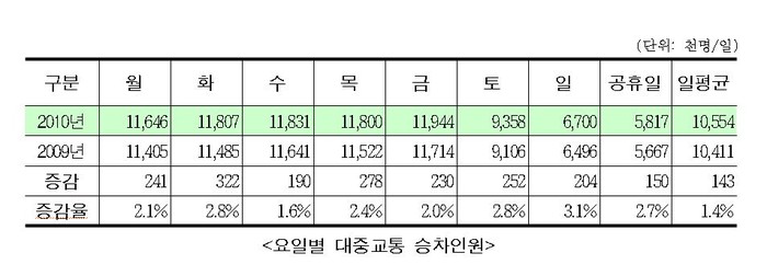 금요일 심야시간대에는 승차 인원이 하루평균 14만5천명으로 월요일의 7만8천명보다 배나 많았다. 각종 모임에서 '한잔'하고 자가용 대신 대중교통을 타고 귀가하는 경우가 많다는 의미다.