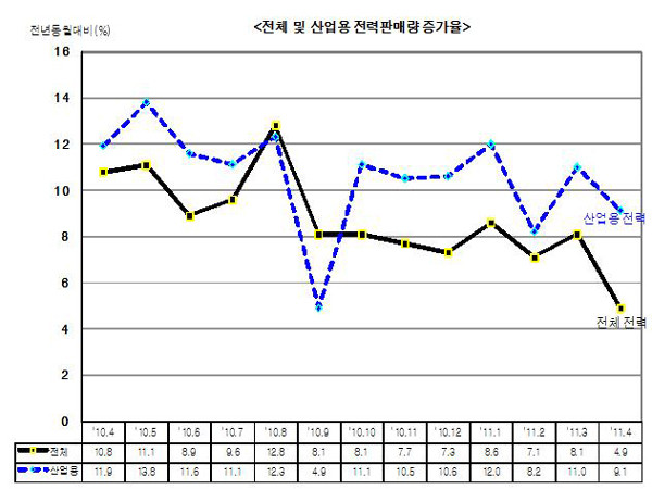 지경부가 밝힌 4월 산업용 전력판매량의 산업별 증가세를 보면 기계장비(16.9%), 화학제품(13.1%), 철강(13.9%), 자동차(9.5%) 등 ‘전력다소비 업종’에서 높은 증가세를 보인 것으로 나타났다.