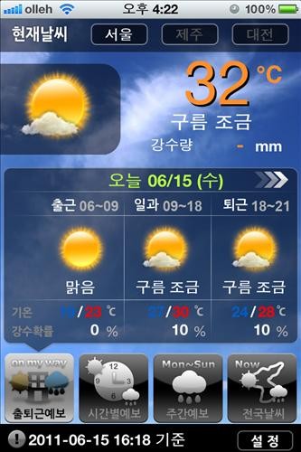 KT는 "올레날씨는 가입자 수가 출시 후 30일 만에 50만명, 5개월 만에 100만명을 돌파한 1위 날씨 앱"이라며 "아이폰 이용자 3명 중 1명 이상이 이 앱을 쓰는 셈"이라고 설명했다.
