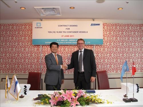 대우조선해양은 세계 최대 컨테이너 선사인 AP 몰러-머스크사로부터 1만8천TEU(1TEU는 20피트 컨테이너 1개)급 초대형 컨테이너선 10척을 추가로 수주했다고 27일 밝혔다.