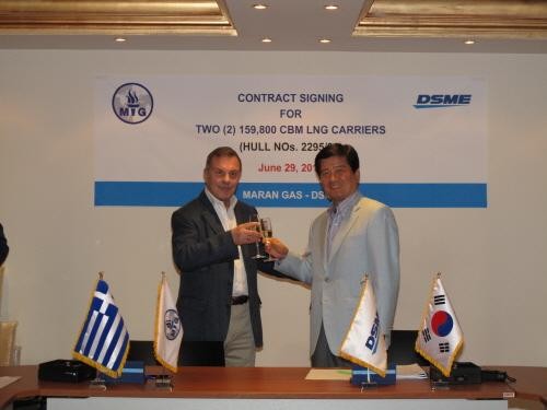 남상태 대표이사는 그리스 아테네에서 안젤리쿠시스 존 안젤리쿠시스(John Angelicoussis) 회장과 수주 계약서에 서명했다.