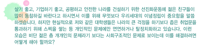 '취직문제 때문에, 여론에 휩쓸려 나의 인생을 값싸게 팔아 넘길 수는 있는 것인가' 고민하지 않는 학생은 지도자가 될 수 없습니다. 사회구조적인 문제라고 체념하지 말고 자신의 문제부터 생각하십시오. 우리에게는 지도자가 필요합니다.