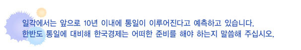 한반도 통일에 대비해 한국경제는 어떠한 준비를 해야 하는지 말씀해 주십시오.