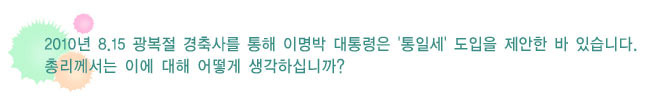 아직 정부 차원의 구체안은 나오지 않고 있습니다. 독일의 경우, 1990년부터 2009년까지 20년간 무려 2조 유로(약3,000조원)의 통일비용을 투입했다는 보고가 있는데 우리나라의 경우 통일 직후의 단기적 비용만하더라도 50조 내지 100조 원이 필요하다고 예측한 바 있습니다. 이러한 천문학적 비용에 대비하여 통일세를 신설하자는 것인데, 어떤 형태로던 통일 기금 축적은 불가피 합니다.