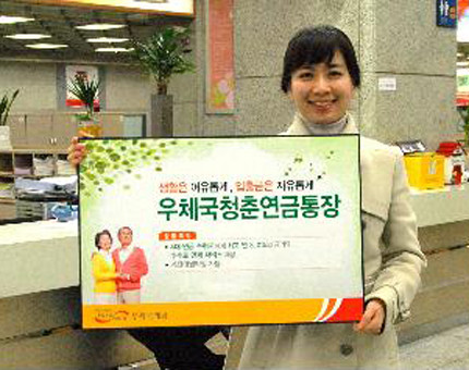 지식경제부 우정사업본부(본부장 김명룡)는 16일 “국민연금, 공무원연금 등 4대 연금 수령자의 노후생활을 도와주는 ‘우체국청춘연금통장’을 전국 우체국에서 판매한다”고 밝혔다.
