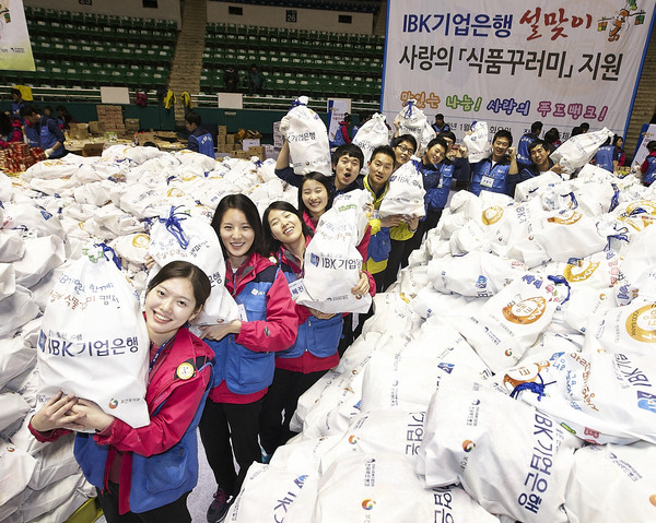 IBK기업은행이 서울 중구 장충체육관에서 8천여개의 식품꾸러미를 만들기 행사를 가졌다고 18일 밝혔다. 설을 맞아 식료품가격 상승으로 어려움에 처한 소외계층을 돕자는 취지인 것.