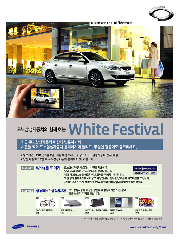 르노삼성자동차(대표이사: 프랑수아 프로보)가 4일 한 달간 전국 영업지점을 방문하여 매장 내 전시 차량의 사진을 찍어 응모한 고객에게 추첨을 통해 경품을 제공하는 ‘White Festival’ 이벤트를 진행한다고 밝혔다.