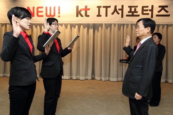 IT서포터즈 대표들이 KT 이길주 홍보실장(오른쪽)에게 '올해의 활동 다짐'에 대해 선서를 하고 있는 모습.