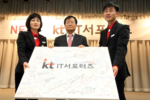 IT서포터즈 대표들이 KT 이길주 홍보실장(가운데)에게 '올해의 각오와 희망 메세지'를 적은 보드를 전달하고 있다.