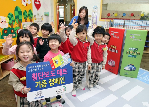 현대자동차는 12일 안전생활실천시민연합(이하 안실련)과 함께 어린이 교통사고 예방을 위해 ‘교육용 횡단보도 매트’와 ‘영상’을 유치원과 어린이집에 기증한다고 밝혔다.