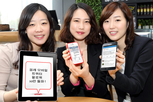 KT는 14일 스마트폰 및 모바일 서비스 관련 전문 트위터인 올레모바일(@olleh_mobile)이 13일 23시 기준 업계 최초로 10만 팔로워를 돌파했다고 밝혔다.