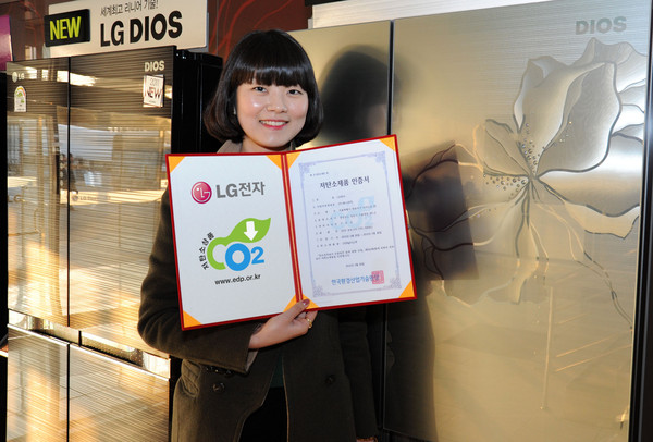 LG 디오스 양문형 냉장고는 ‘리니어 컴프레서’ 효율 증대 및 고효율 단열기술로 탄소배출량을 약 12.5% 줄여 ‘저탄소상품’ 인증을 받았다.
