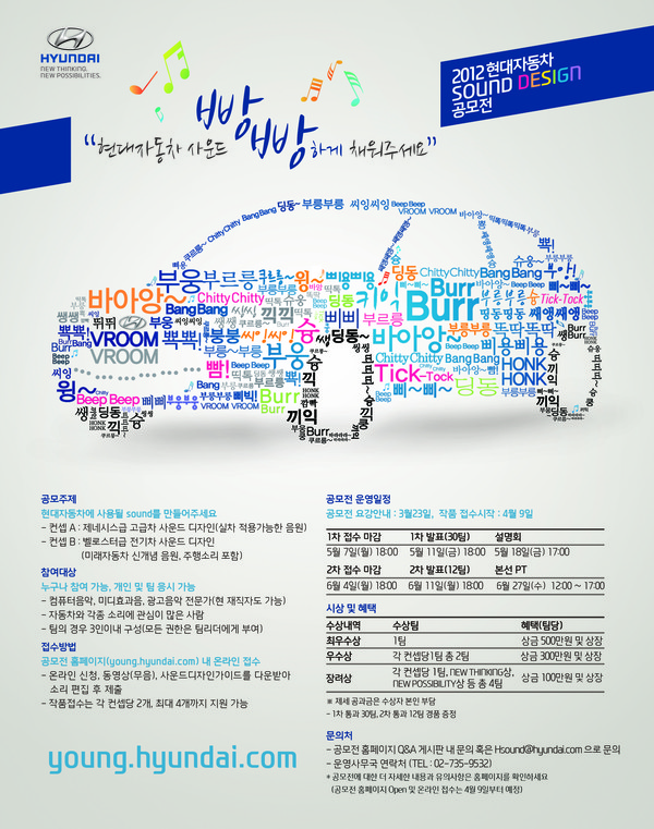 신청자는 영현대 홈페이지(http://young.hyundai.com)에 개설된 ‘사운드 디자인 공모전’에서 온라인으로 응모하면 된다.