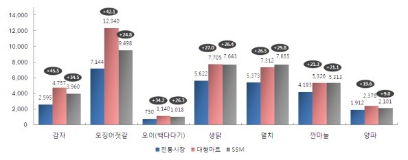 대형마트보다 감자가 45.5% 쌌다. 이어 ▲ 오징어젓갈(42.1%) ▲ 오이(34.2%) ▲ 생닭(27.0%) ▲ 멸치(26.5%) ▲ 깐마늘(21.3%) 등의 순으로 조사됐다.