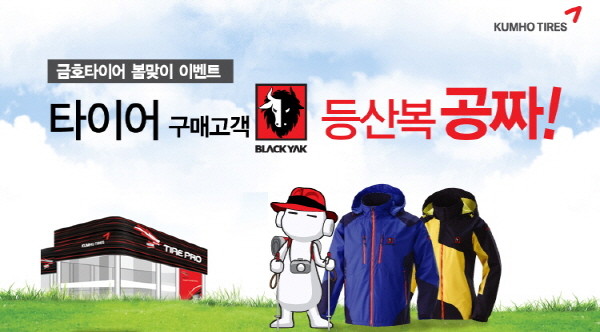 내달 1일부터 승용차용 마제스티 솔루스, 엑스타 LE스포트, SUV용 시티벤쳐 프리미엄 등 금호타이어의 프리미엄 제품을 4개 이상 구입한 소비자를 대상으로 35만원 상당의 블랙야크 아웃도어 자켓 교환권을 제공하기로 한 것.