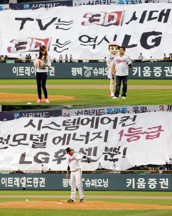 이날 경기장에는 LG전자 한국마케팅본부 1,200여명의 임직원들이 ‘시스템에어컨 전모델 에너지 1등급 LG 휘센 뿐!’·‘TV는 3D시대, 3D는 역시 LG’ 라고 쓰인 초대형 플래카드를 선보였다.