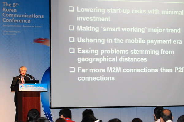 이 회장은 스마트 컨버전스를 통해 기존 제한적인 재화 유통에서 벗어나 앱마켓 시장과 게임, 음악 등의 엔터테인먼트가 교육으로 확대되고 SW가 활성화 되며 새로운 무한 신시장의 기회가 열릴 것이라 전망했다.스마트 컨버전스의 특징으로 “참신한 앱 개발이나 아이디어만으로 소자본창업이 가능해지고 의료, 영농분야에서 ICT를 활용하면서 생산성이 향상, 소득격차가 해소될 뿐 아니라 에너지나 교통난 등에서 효과적인 솔루션이 제공되며 인류의 사회적 문제 해결에도 기여할 수 있을 것”이라고 밝혔다.
