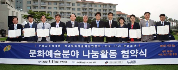 현대자동차그룹은 지난 11일 제주도 해비치호텔&리조트에서 한국문화예술회관연합회와 예술의 전당 등 전국 10개의 문화예술회관과 ‘문화예술분야 나눔사업 협약’을 맺었다고 12일 밝혔다.