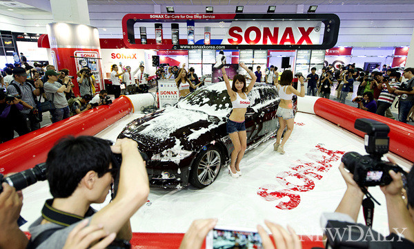 한 레이싱 걸이 세차 퍼포먼스를 펼치며 손을 들어 관람객과 취재진들의 환호에 답하고 있다. 차량 관리 요령 중 하나가 바로 광택 관리다. 이런 미녀와 함께 내 차를 관리한다면 얼마나 좋을까.