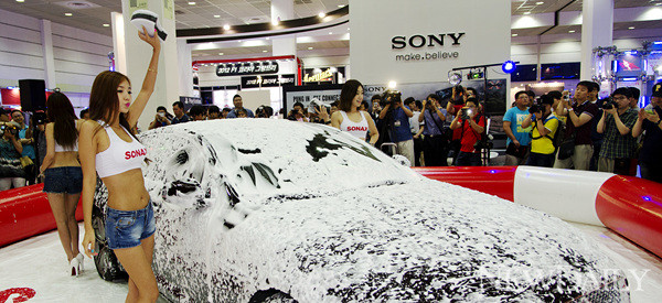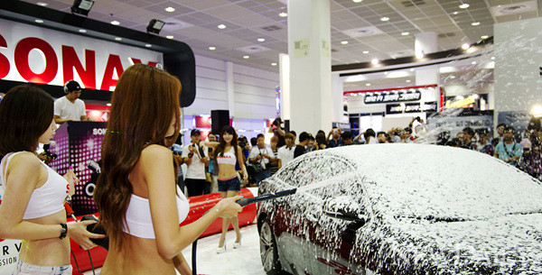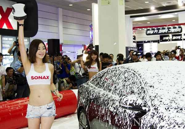 레이싱 걸들이 차에 거품을 뿌리고 있다. 왼쪽 레이싱 걸은 예쁘게 보이려고 볼에 잔뜩 바람을 넣은 게 뒤에서도 보일 정도다.