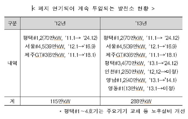 이 공고에 따르면 지경부는 2012년과 2013년 노후 문제로 폐기하려 했던 평택 발전소, 서울 발전소 등 일부 발전시설 수리해 재가동할 계획이다. 이를 통해 403만kW의 발전량을 계속 유지한다.