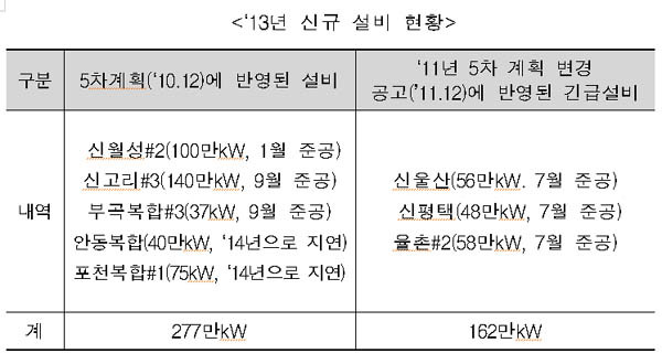 긴급 설비증설을 통해 전력량을 늘리는 계획도 있다. 2013년에는 신월성원전 2호기, 신고리원전 3호기, 부곡 복합발전소, 안동 복합발전소 등의 준공을 통해 439만kW의 전력을 더 생산해낼 계획이라고 한다.